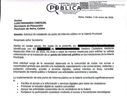 Hemos presentado formalmente esta solicitud y quedamos atentos a la respuesta del municipio. La instalación de este punto de Internet público no requiere grandes inversiones, pero sí requiere voluntad política y compromiso con el desarrollo de Neira.