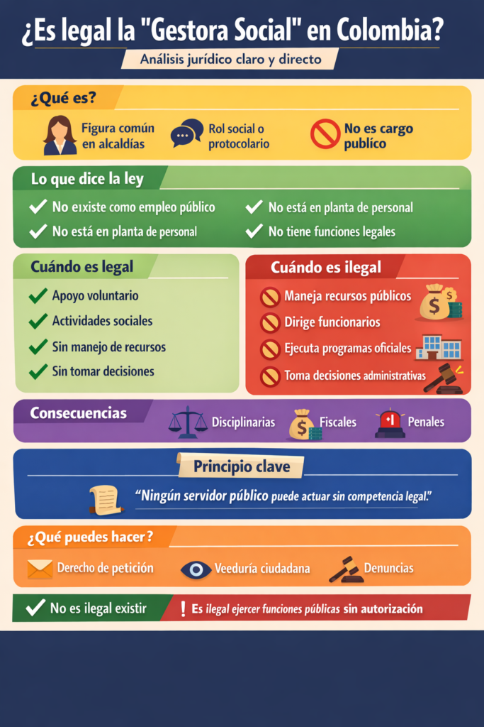 El presente artículo examina la naturaleza jurídica de la denominada “Gestora Social” en Colombia desde la perspectiva del derecho administrativo y el régimen del empleo público. A partir del análisis de la Constitución Política de 1991, la Ley 909 de 2004, el Decreto Ley 785 de 2005 y la Ley 136 de 1994, se establece que dicha figura no constituye un empleo público ni forma parte de la estructura administrativa del Estado. No obstante, se precisa que su existencia como rol protocolario o de apoyo social no es per se ilegal. La irregularidad jurídica surge cuando se le asignan funciones públicas, se le permite administrar recursos o actuar con respaldo institucional sin competencia legal, lo cual puede generar responsabilidades disciplinarias, fiscales y penales.