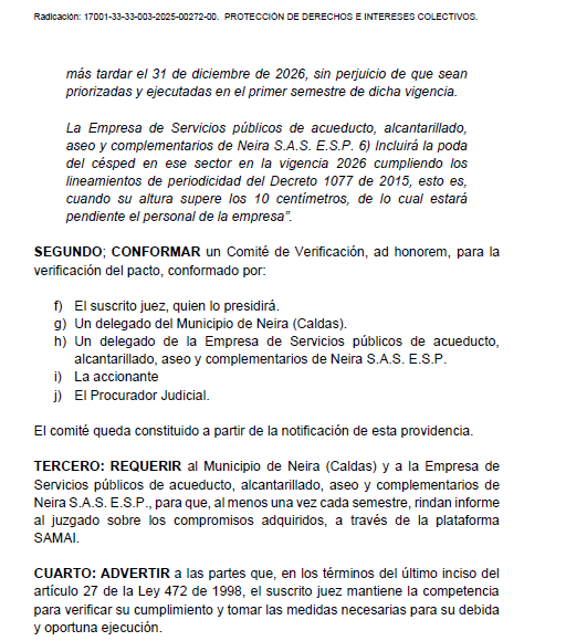 El 5 de diciembre de 2025 se celebró la audiencia de pacto de cumplimiento, donde las partes llegaron a un acuerdo que fue aprobado mediante sentencia del 28 de enero de 2026 Rad: 17001-33-33-003-2025-00272-00. por el Juzgado Tercero Administrativo de Manizales.