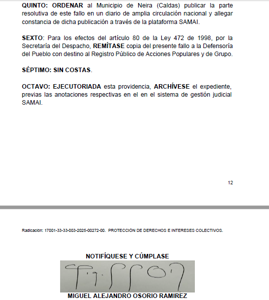 - Publicación: Se ordenó al Municipio publicar la parte resolutiva del fallo en un diario de amplia circulación nacional